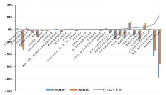 图2 30个细分行业出厂价格7月同比增速较6月变化幅度;资料来源:Wind,中山证券研究所。