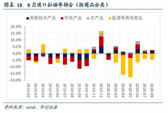 从主要进口商品大类对进口增速的拉动来看,8月由于大宗商品进口数量收窄,价格延续下跌,对进口的负向拉动有所扩大,达到-4.7%,农产品进口拉动率进一步收窄至0.2%。而机电产品与高新技术产品进口拉动率分别为0.8%、1.6%,维持7月的正向拉动。