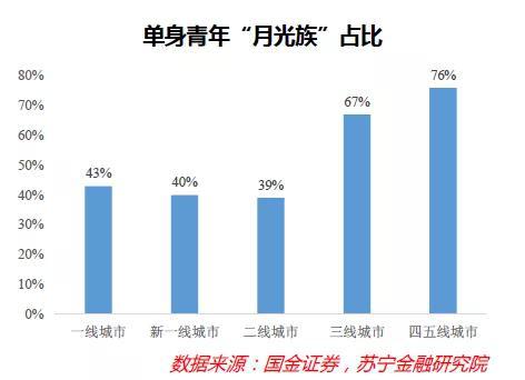 国金证券的数据显示,在一线、新一线和二线城市,大约40%左右的单身青年们都处于“月光”的生活状态;随着城市等级向下及月收入的降低,“月光”比例大幅提升,四五线城市的单身年轻人中,“月光族”所占比例高达76%。从收入水平看,大部分一线城市的单身青年月度可支配收入在8000~15000元,而从新一线城市往下,大部分单身青年的月度可支配收入仅为2000~5000元。