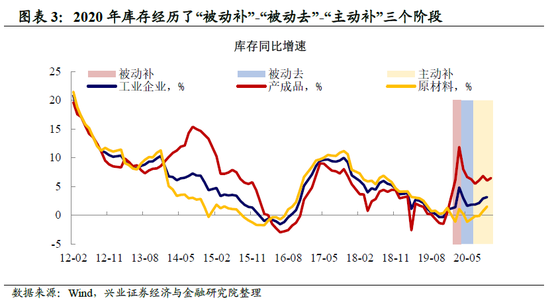 2020年以来,库存周期经历了“被动补”-“被动去”-“主动补”阶段。2019年底库存周期已经处于底部,正如我们在2019年12月30日报告《库存周期,心动还是幡动》中指出,未来库存或触底反弹,真正的回升依赖之后的长期需求改善。然而,2020年1月开始的疫情对经济和生产生活的冲击使得投资和消费需求骤降,但企业的生产并不能迅速反应,因此企业进入了被动补库存的阶段。2020年3月开始,疫情逐步得到控制,需求逐渐得到改善,企业在疫情期间积压的库存得以释放,生产的恢复稍慢于需求,从而进入被动去库存的阶段。2020年7月以来,企业的生产逐渐恢复,需求也稳步上升,部分行业开始主动补库存。