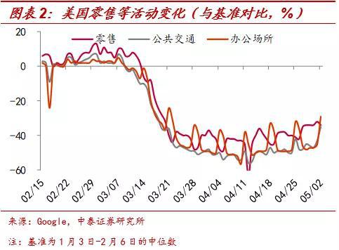 一方面,疫情冲击带来了投资者对美国经济的悲观预期。美国一季度GDP环比折年率为-4.8%,创08年4季度以来新低,同比也为09年4季度以来新低,同时,一季度GDP并未完全反映疫情影响。据谷歌大数据统计,截止5月2日,美国零售活动、交通运输活动以及办公活动仍较基期下滑30%左右,预计美国二季度负增长程度将更大。
