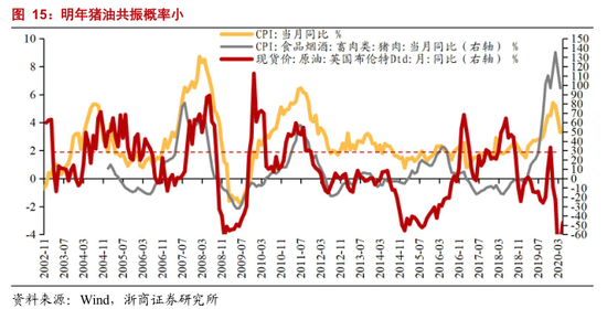 先看通胀,明年猪油大概率难以共振,通胀走势较为可控。我们在2018年的“风起通胀”系列报告中提出,通过对我国通胀的历史回顾与梳理,猪价和原油价格是我国CPI最关键的两项影响因素,猪价与油价叠加共振时才会出现CPI的大幅上行,而明年的物价环境仍不具备“猪油共振”的条件。先看油价,明年一季度油价面临较低基数,同比增速可能大幅冲高,对我国CPI构成一定压力。但猪肉价格同比不会在明年一季度进行叠加。我国有明显的猪周期,周期长度一般在3-4年左右,本轮猪周期受非洲猪瘟扰动,波动幅度更大,今年2月猪肉CPI同比增速攀升至历史新高135.2%,3月、4月依次回落至116.4%和96.9%,我们预计2月数据就是本轮猪周期峰值,随后将进入下行区间。能繁母猪存栏量自2019年9月触底后,已经由当时的底部1913万头稳步增加至2020年3月的2164万头,环比增长13.1%,生猪存栏数据自2019年12月起数据缺失,但2019年11月相比10月的底部也出现了环比改善,从母猪存栏至生猪出栏存在约一年左右的滞后期,我们认为今年三、四季度猪肉供应量将有大增,需求稳定的情况下,今年下半年至明年上半年将是猪肉价格同比增速下行探底的阶段,对CPI难以构成上行压力。因此,明年一季度猪油再次不共振,控通胀难以成为货币政策首要目标。