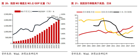 M2的快速扩张为我国市场提供了宽裕的货币环境。用M2占GDP比重度量存量流动性,我国M2/GDP近几年始终在200%附近波动,2016年达到208%的历史峰值,此后随货币政策收紧有所下行,2019年为200%,M2存量仍是名义GDP的两倍之多。今年经济回落压力加大,货币政策强化逆周期调控,“广义货币供应量和社会融资规模增速明显高于去年”的政策基调下,M2增速或将远高于名义GDP增速,3月M2增速大幅提高1.3个百分点至10.1%,这是自2017年3月以来首次重回两位数增长,4月继续走高1个百分点至11.1%,总体我们预计M2全年增速有望达到12%,因此今年M2/GDP将大概率继续抬升,货币环境宽裕叠加资本管制仍然较为严格,过剩的流动性要么反映在物价中,要么反映在资产价格中。
