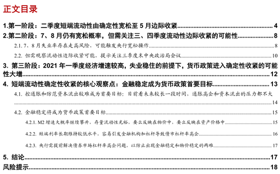 第三阶段:确定性收紧。2021年一季度,GDP低基数下,可能上行至10%以上,只要就业没有大问题,货币政策不需要等到有通胀压力或资本流出压力,就会采取前瞻性手段,纠正短端的流动性宽松,实现去债市杠杆,保证一旦出现通胀,货币政策可以顺利收紧,而不是陷入一收紧流动性、债券市场就出现系统性风险隐患的局面,避免央行难以在金融稳定和物价稳定间进行抉择。